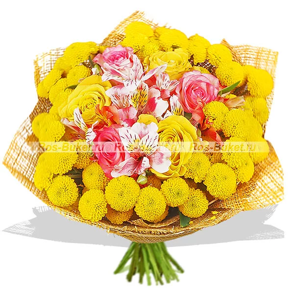 ДЕЛЮКС: хризантема кустовая желтая "сантини" - 15 шт, роза розовая - 9 шт, роза желтая - 8 шт, альстромерия розовая - 4 шт, натуральная сетка.
